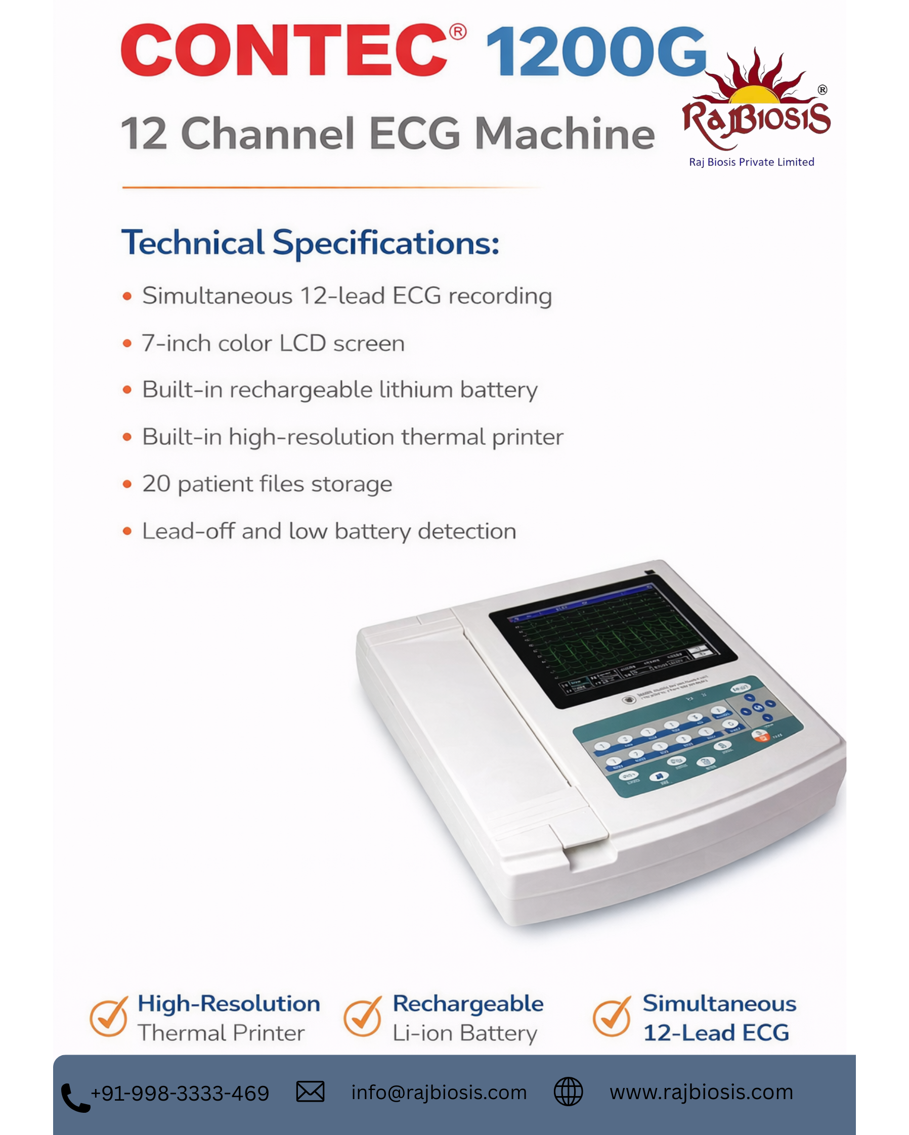 The CONTEC 1200G 12-Channel ECG Machine is a high-performance, portable electrocardiograph designed for accurate cardiac diagnosis in hospitals, clinics, and diagnostic centers. It supports simultaneous 12-lead ECG acquisition, ensuring precise waveform capture and detailed cardiac analysis. Equipped with a large 7-inch color LCD display, the device provides clear real-time waveform monitoring and user-friendly operation. Its built-in high-resolution thermal printer enables immediate waveform printouts in multiple formats, making it suitable for routine and emergency cardiac assessments. The compact and lightweight design enhances portability, while the rechargeable lithium-ion battery ensures uninterrupted operation during power outages or bedside use. Technically, the CONTEC 1200G offers simultaneous 12-lead ECG recording with automatic measurement and interpretation functions. It features adjustable recording modes (auto/manual), multiple print formats, and digital signal processing for improved accuracy and reduced interference. The device includes lead-off detection, low battery indication, and internal storage capacity for approximately 20 patient records, with options for data transfer via USB interface. It operates with standard ECG paper and provides stable baseline performance with high sampling precision. Designed for reliability and efficiency, the CONTEC 1200G delivers consistent, high-quality ECG results for clinical decision-making. #ECGMachine #12ChannelECG #ECGDevice #ECGEquipment #CardiologyEquipment #MedicalEquipment #HospitalEquipment #DiagnosticEquipment #PortableECG #DigitalECG #ECGMonitor #HealthcareTechnology #ClinicEquipment #CardiacCare #MedicalDevices #ECGTesting #HeartMonitoring #NowFloatsBusiness #MedicalSupplies #BiomedicalEquipment