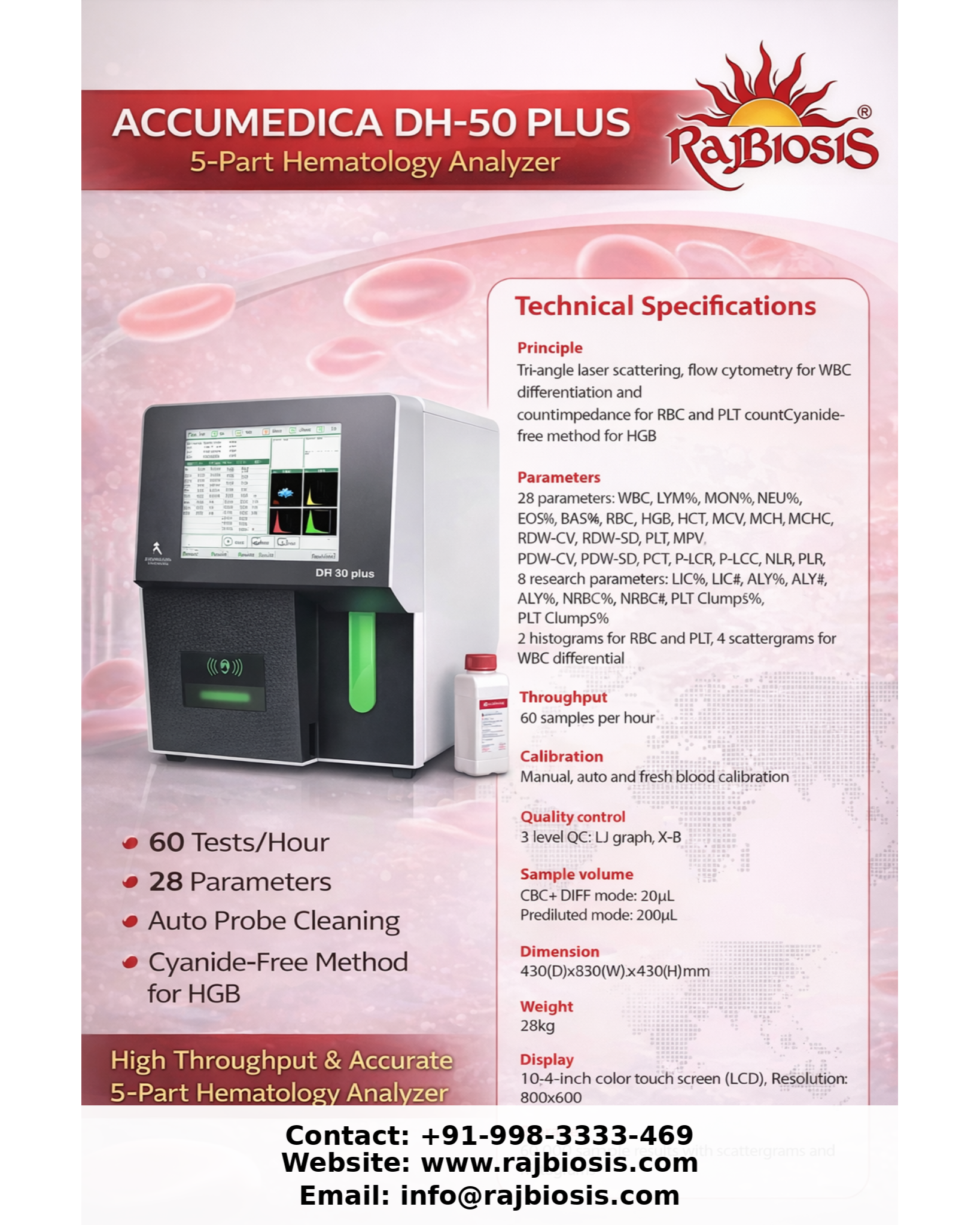 The ACCUMEDICA DH-50 PLUS 5-Part Hematology Analyzer is an advanced and high-performance diagnostic system designed for accurate and efficient complete blood count (CBC) analysis in clinical laboratories. Utilizing tri-angle laser scattering technology and flow cytometry for WBC differentiation, along with the impedance method for RBC and platelet counting, the analyzer ensures precise and reliable results. It features a cyanide-free method for hemoglobin (HGB) testing, making it safe and environmentally friendly. The system delivers a throughput of up to 60 samples per hour and provides 28 parameters along with additional research parameters, offering comprehensive hematological insights. It supports 2 histograms (RBC, PLT) and 4 scattergrams for WBC differential analysis, enhancing diagnostic accuracy. The analyzer is equipped with a 10.4-inch color touch screen display (800×600 resolution) for easy operation and clear data visualization. It requires a sample volume of 20 µL in CBC+DIFF mode and 200 µL in prediluted mode, making it efficient for routine as well as specialized testing. The device includes auto probe cleaning, ensuring minimal maintenance and improved hygiene. It supports manual, auto, and fresh blood calibration, along with 3-level quality control (LJ graph and X-B analysis) for consistent performance. With a storage capacity of up to 60, 000 sample results including histograms and scattergrams, it enables efficient data management. The analyzer has compact dimensions of 430 (D) × 830 (W) × 430 (H) mm and weighs approximately 28 kg, making it suitable for laboratories with limited space. Overall, the ACCUMEDICA DH-50 PLUS offers a perfect combination of high throughput, accuracy, safety, and reliability for modern hematology diagnostics. #HematologyAnalyzer #5PartAnalyzer #Accumedica #DH50Plus #CBCAnalyzer #BloodTesting #DiagnosticEquipment #MedicalDevices #LabEquipment #ClinicalDiagnostics #WBCDifferential #HematologyLab #HealthcareTechnology #LaboratorySolutions #MedicalInnovation #HighThroughput #AccurateResults #CyanideFree #AutoProbeCleaning #FlowCytometry #LaserScattering #HospitalEquipment #PathologyLab #MedTech #DiagnosticSolutions