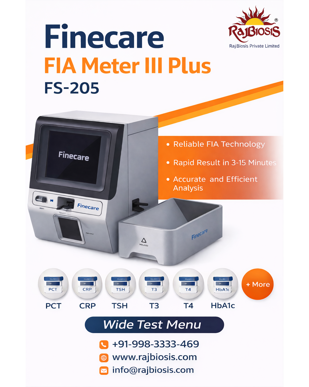 The Finecare FIA Meter III Plus (FS-205) is an advanced fluorescence immunoassay analyzer designed for rapid, accurate, and reliable point-of-care diagnostics. Utilizing cutting-edge FIA technology, this system enables quantitative detection of various biomarkers from whole blood, serum, plasma, or urine within minutes. It is equipped with a multi-channel system that allows simultaneous testing of multiple parameters, making it highly efficient for laboratories, hospitals, and clinics. With its intuitive touch screen interface, built-in thermal printer, and seamless LIS/HIS connectivity, the FS-205 ensures smooth workflow and fast decision-making. Its high throughput capacity and precise temperature-controlled reaction environment make it an ideal solution for modern diagnostic needs. The Finecare FIA Meter III Plus (FS-205) is equipped with advanced fluorescence immunoassay (FIA) technology, ensuring highly sensitive and accurate quantitative results with excellent correlation to standard CLIA methods. It features a multi-channel system with up to 20 testing channels, allowing simultaneous processing and achieving high throughput of up to 200 tests per hour. The analyzer delivers rapid results within 3–15 minutes, making it ideal for fast clinical decision-making. Its internal temperature control system maintains optimal reaction conditions for consistent performance, while the 10-inch touchscreen provides an intuitive and user-friendly interface. The device includes a built-in thermal printer for real-time result printing and supports external printers as well. With automatic ID chip recognition for calibration data, seamless LIS/HIS connectivity, and an automatic cartridge ejection system, the FS-205 enhances workflow efficiency and minimizes manual intervention. #Finecare #FIAMeter #FS205 #Immunoassay #DiagnosticAnalyzer #POCT #PointOfCare #MedicalEquipment #LabEquipment #InVitroDiagnostics #IVD #RapidTesting #ClinicalDiagnostics #HealthcareTechnology #LaboratorySolutions #MultiChannelAnalyzer #HighThroughput #AccurateResults #CRP #PCT #HbA1c #ThyroidTesting #TSH #T3 #T4