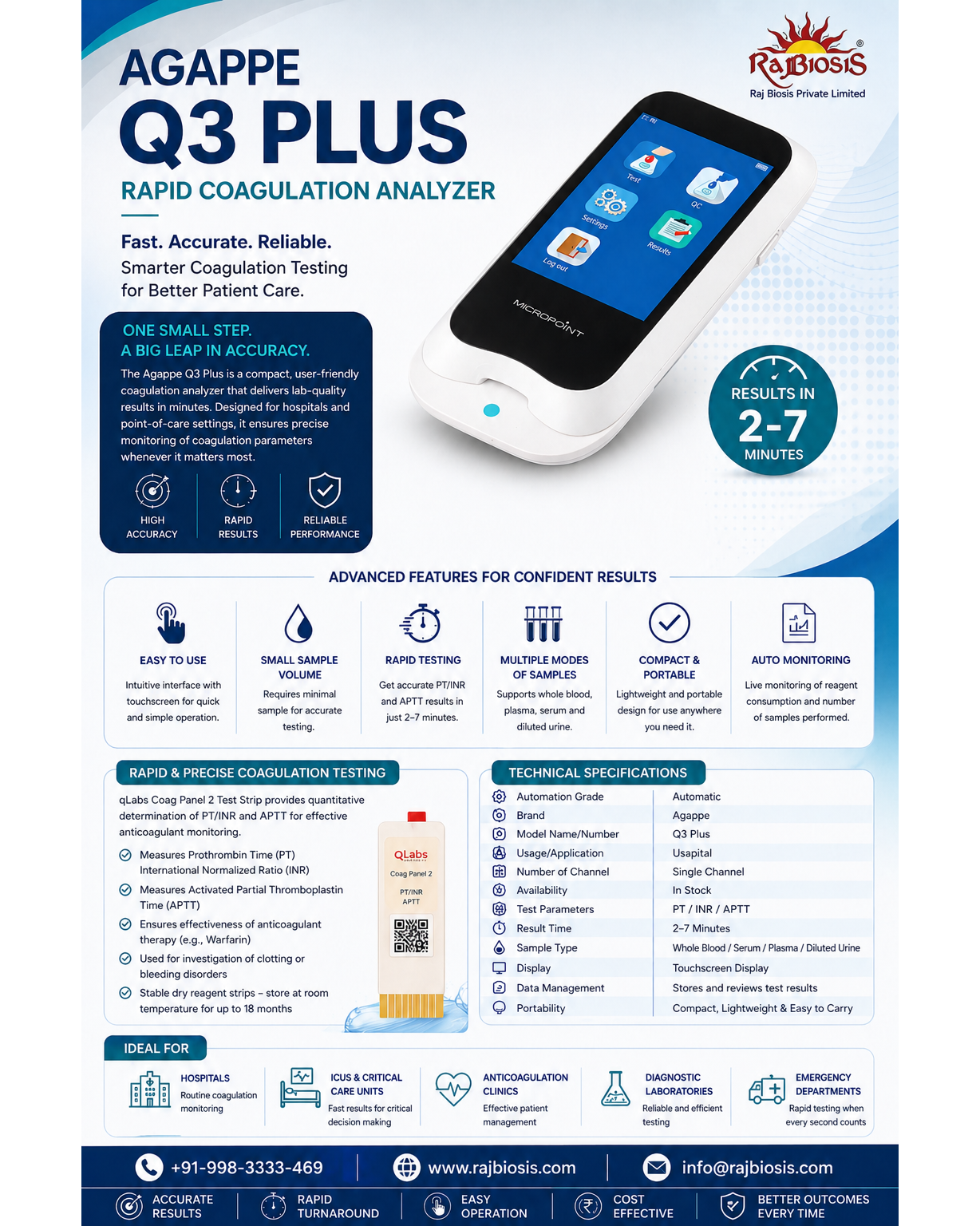 The Agappe Q3 Plus Rapid Coagulation Analyzer is a compact, user-friendly diagnostic device designed to deliver fast, accurate, and reliable coagulation test results at the point of care. Engineered for hospitals, clinics, and emergency settings, it provides lab-quality results within minutes, enabling timely clinical decision-making and improved patient outcomes. Its intuitive touchscreen interface and portable design make it ideal for use in diverse healthcare environments, ensuring precise monitoring of coagulation parameters whenever and wherever required. Technical Specifications The Agappe Q3 Plus operates with an automatic system and is designed for hospital use with a single-channel testing capability. It supports key coagulation parameters including Prothrombin Time (PT), International Normalized Ratio (INR), and Activated Partial Thromboplastin Time (APTT), delivering results in approximately 2–7 minutes. The device is compatible with multiple sample types such as whole blood, serum, plasma, and diluted urine, offering flexibility in diagnostic applications. It features a responsive touchscreen display for easy navigation and includes built-in data management to store and review test results efficiently. The analyzer is compact, lightweight, and portable, making it convenient for bedside or on-the-go testing. Key Features The Agappe Q3 Plus stands out for its ease of use, requiring minimal training due to its intuitive interface and simple workflow. It uses a small sample volume, ensuring patient comfort while maintaining high accuracy. Rapid testing capability allows clinicians to obtain PT/INR and APTT results in just a few minutes, which is critical in emergency and critical care scenarios. The system supports multiple testing modes and sample types, enhancing its versatility across different clinical needs. Its compact and portable design ensures accessibility in various healthcare settings, while auto-monitoring features help track reagent usage and test volumes for better operational efficiency. Overall, the analyzer delivers high accuracy, reliable performance, and consistent results, making it a dependable tool for coagulation testing. #AgappeQ3Plus #CoagulationAnalyzer #RapidTesting #PointOfCare #MedicalDevices #Diagnostics #HealthcareTechnology #PTINR #APTT #LabEquipment #HospitalUse #CriticalCare #EmergencyDiagnostics #AccurateResults #FastResults #PortableDevice #MedicalInnovation #PatientCare #ClinicalDiagnostics #BloodTesting #HealthcareSolutions #RajBiosis #MedTech #DiagnosticTools #EasyToUse