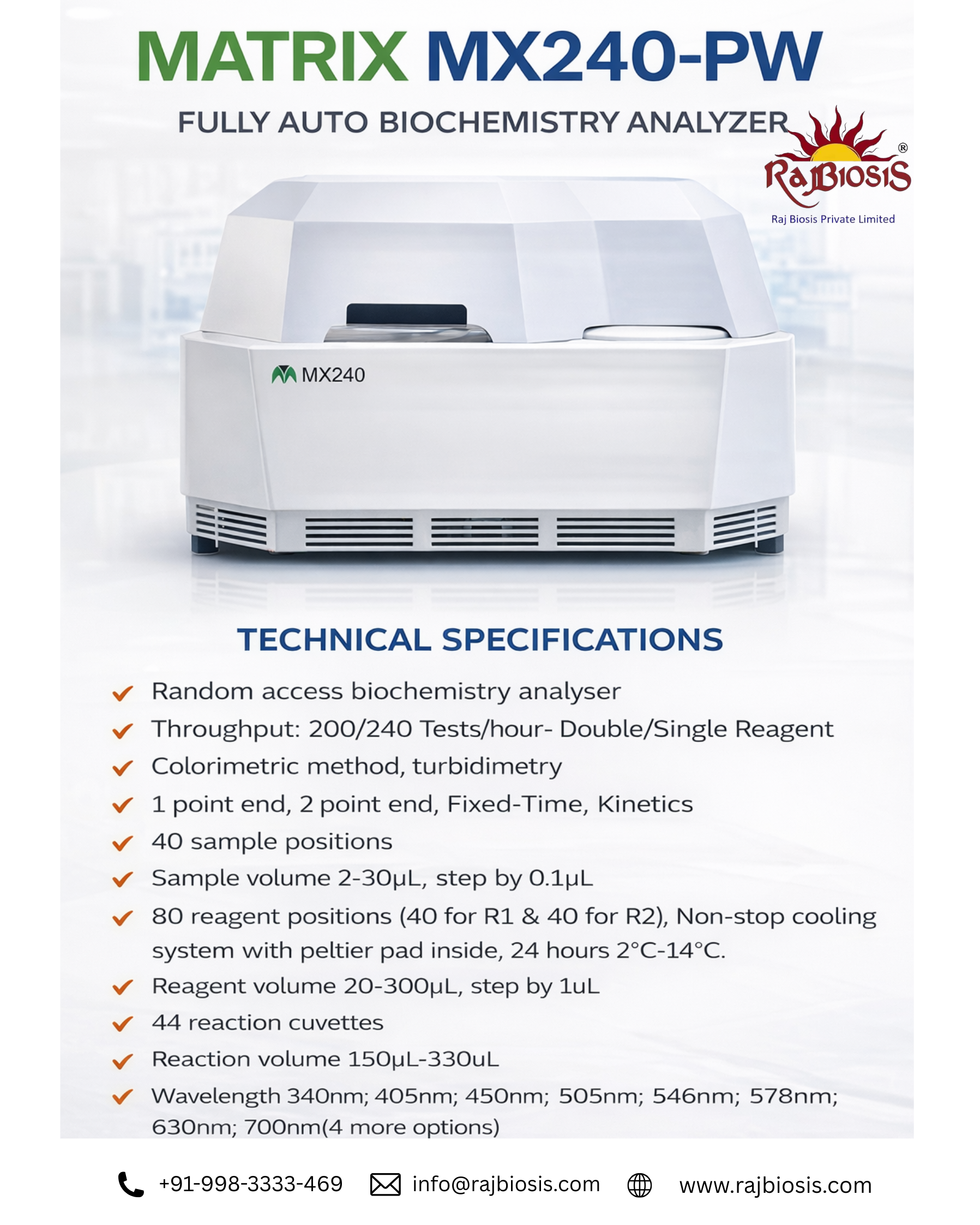 The Matrix MX240 Fully Auto Biochemistry Analyzer is a compact, high-performance random access analyzer designed to deliver accurate and efficient biochemical testing for clinical laboratories. With a throughput of up to 200–240 tests per hour, it supports both single and double reagent systems, ensuring flexibility for a wide range of diagnostic applications. The analyzer utilizes advanced colorimetric and turbidimetric methods, offering multiple measurement modes including end-point, two-point, fixed-time, and kinetic analysis. Equipped with 40 sample positions and 80 refrigerated reagent positions (40 for R1 and 40 for R2), it features a built-in non-stop cooling system with a Peltier pad that maintains stable temperatures between 2°C–14°C for 24-hour reagent preservation. The system allows precise sample handling with volumes ranging from 2–30 µL (0.1 µL steps) and reagent volumes from 20–300 µL (1 µL steps), ensuring high accuracy and minimal wastage. The MX240 includes 44 reaction cuvettes and supports reaction volumes from 150–330 µL, along with multi-wavelength photometry (340nm to 700nm with additional optional wavelengths) for comprehensive testing capability. With its space-saving design (745mm × 540mm × 530mm) and reliable performance, the Matrix MX240 is an ideal solution for medium to high workload laboratories seeking speed, precision, and operational efficiency. #FullyAutoBiochemistry #BiochemistryAnalyzer #ClinicalChemistry #LabAutomation #DiagnosticEquipment #MedicalLaboratory #InVitroDiagnostics #IVDTechnology #LaboratoryInstruments #HighThroughputAnalyzer #RandomAccessAnalyzer #ClinicalDiagnostics #HealthcareTechnology #PathologyLab #AutomatedTesting #BiochemicalAnalysis #LabSolutions #MedicalDevices #HospitalEquipment #LaboratoryAutomation