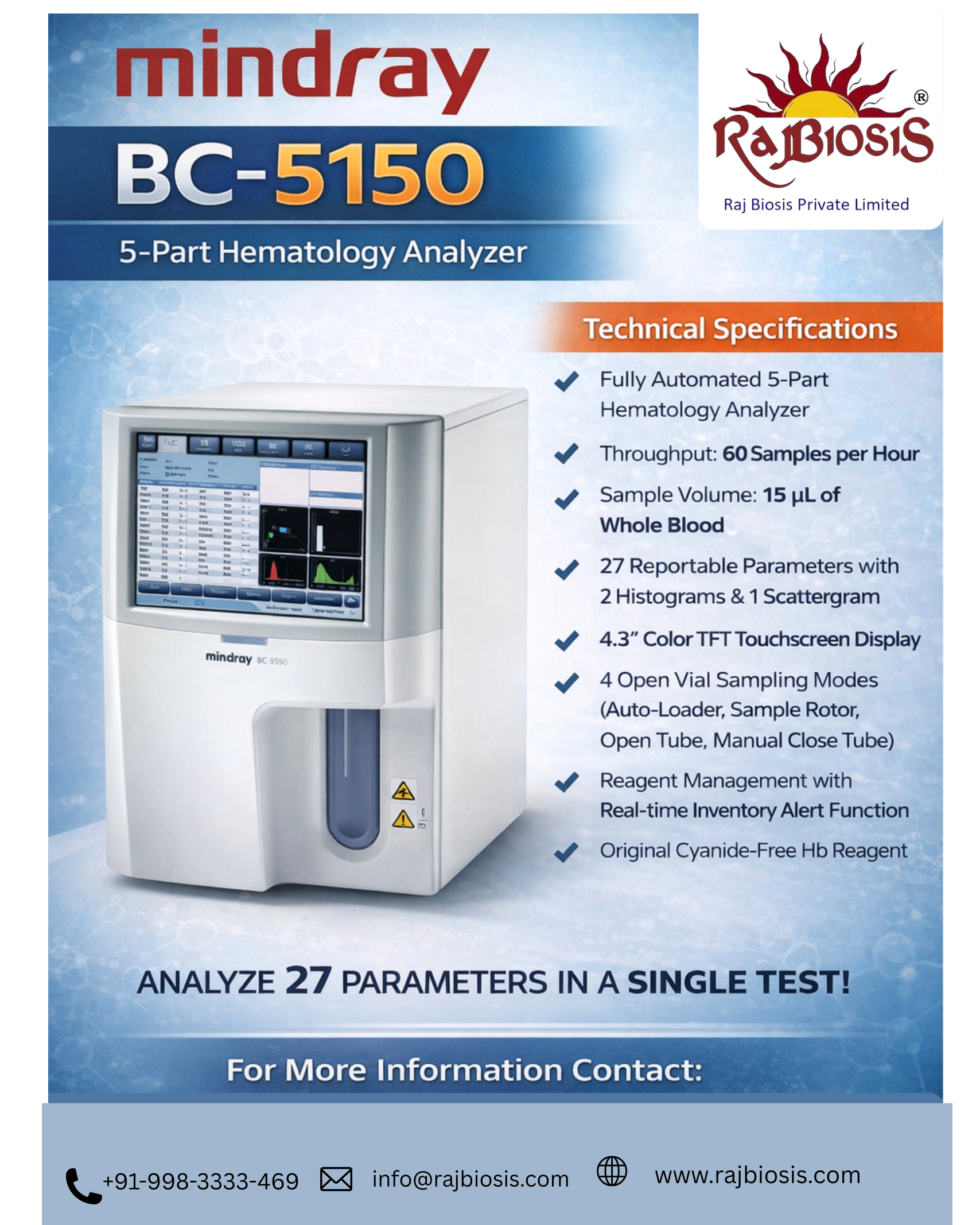 The Mindray BC-5150 is a fully automated 5-part differential hematology analyzer designed to deliver accurate and reliable complete blood count (CBC) results for medium-volume laboratories. It utilizes impedance technology for RBC and platelet counting, cyanide-free reagent methodology for hemoglobin measurement, and advanced flow cytometry with laser scatter and chemical dye for precise WBC 5-part differential analysis. The system reports 25 routine parameters along with 4 research parameters, and provides 3 histograms (WBC, RBC, PLT) plus 3 scattergrams for detailed cell population analysis. With a throughput of up to 60 samples per hour, it requires minimal sample volume (15 µL in whole blood mode) and offers excellent linearity, precision, and low carryover performance. The analyzer features a 10.4-inch TFT touch screen, supports multi-language operation (English and Chinese), and stores up to 40, 000 results including numeric and graphical data. It offers LAN connectivity with HL7 protocol support for uni- or bi-directional LIS integration, along with USB interfaces and flexible printout options. Compact in design (400 × 320 × 410 mm, 24 kg) and operating within standard laboratory environmental conditions, the BC-5150 is an efficient, user-friendly solution for routine hematology testing. #FullyAutomated #5PartDifferential #FlowCytometry #LaserScatterTechnology #ImpedanceMethod #CyanideFreeHemoglobin #25Parameters #ResearchParameters #60SamplesPerHour #LowSampleVolume #HighPrecision #LowCarryover #40KDataStorage #HL7Connectivity #LISCompatible #TouchScreenDisplay #CompactDesign #UserFriendlyInterface #MultiLanguageSupport #USBAndLANConnectivity