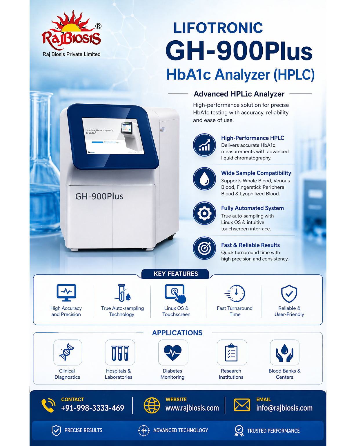 The Lifotronic GH-900Plus HbA1c Analyzer (HPLC) is an advanced, fully automated diagnostic system designed for precise and reliable measurement of glycated hemoglobin (HbA1c), a key parameter in diabetes management. Utilizing high-performance liquid chromatography (HPLC) technology, the analyzer delivers highly accurate and consistent results, making it ideal for clinical laboratories, hospitals, and diagnostic centers. Its user-friendly touchscreen interface, robust Linux-based operating system, and auto-sampling capability ensure seamless operation, reduced manual intervention, and enhanced workflow efficiency. Features The GH-900Plus offers high-performance HPLC technology for superior accuracy in HbA1c testing. It supports multiple sample types including whole blood, venous blood, fingerstick peripheral blood, and lyophilized samples, providing flexibility in various clinical settings. The system is fully automated with true auto-sampling, minimizing human error and increasing throughput. Its intuitive touchscreen interface and Linux operating system enable smooth operation and easy data management. Additionally, the analyzer ensures fast turnaround time with highly precise and reproducible results, making it a reliable solution for routine and high-volume testing environments. Technical Specifications The Lifotronic GH-900Plus operates using advanced HPLC methodology to ensure accurate separation and measurement of hemoglobin variants. It is designed for high efficiency with automated sample handling and minimal maintenance requirements. The system supports continuous operation with stable performance and consistent output. It features a compact benchtop design suitable for laboratories with limited space, along with integrated data management capabilities. The analyzer provides fast processing speed, high sensitivity, and excellent reproducibility, meeting the standards required for modern clinical diagnostics and diabetes monitoring.