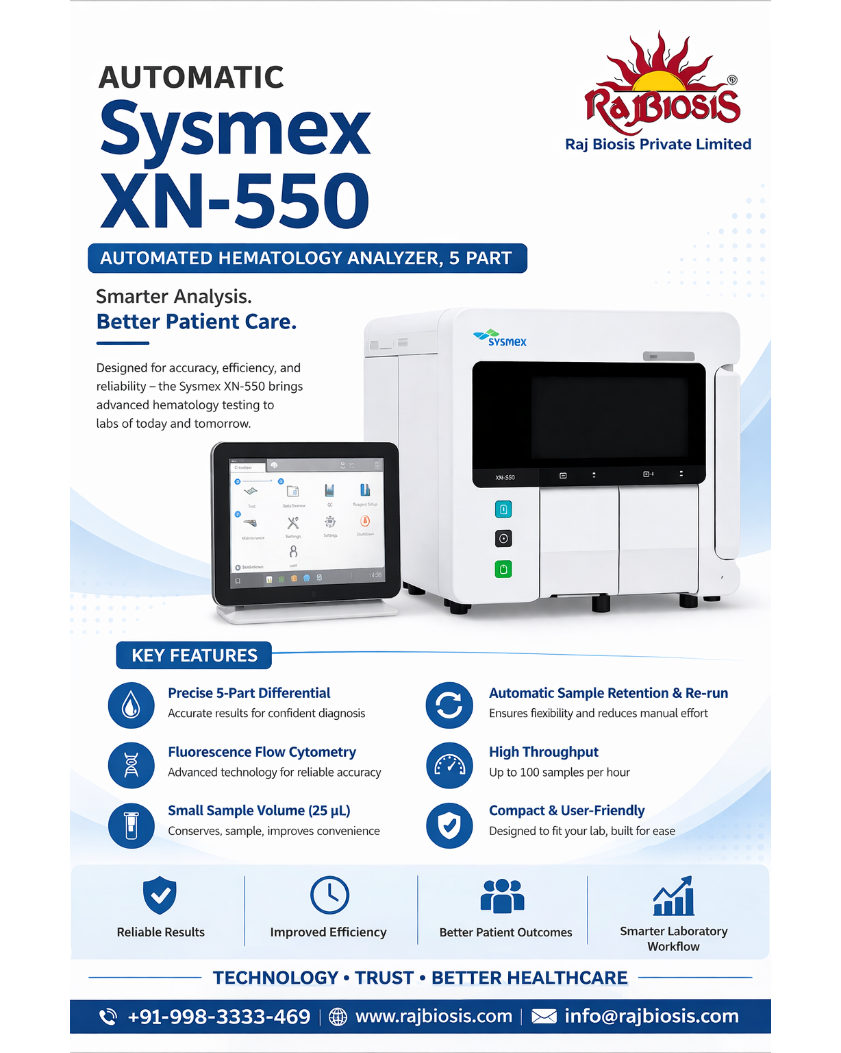 The Sysmex XN-550 is a compact, fully automated hematology analyzer designed for small to mid-sized laboratories, offering advanced diagnostics with high efficiency. It provides a 5-part/6-part differential analysis with high accuracy, delivering reliable Complete Blood Count (CBC) results along with advanced clinical parameters. The analyzer uses fluorescence flow cytometry, hydrodynamic focusing, and cyanide-free SLS technology, ensuring precise and safe hemoglobin and cell analysis. It features an automated sample loader with continuous loading capability, along with rerun and reflex testing functions, which significantly improve workflow and reduce manual intervention. The system also includes an integrated IPU (Information Processing Unit) with a color touchscreen, eliminating the need for an external computer and making operation user-friendly. The analyzer requires only a small sample volume (25 µL), making it suitable for pediatric and low-volume samples, while still maintaining high accuracy. It offers high throughput of up to 60–70 samples per hour, ensuring efficient laboratory performance. Additionally, the XN-550 supports optional reticulocyte (RET) and body fluid analysis, expanding its diagnostic capabilities. It provides advanced clinical parameters such as immature granulocytes (IG) and enhanced RBC/PLT analysis, improving diagnostic confidence. The system is compact, scalable, and upgradeable, allowing laboratories to expand functionality as needed. It also includes intelligent rack sampling, onboard rules for rerun/reflex testing, and high data storage capacity, ensuring smooth and smart laboratory operations. The XN-Series technology offers advanced hematology analysis in a compact footprint, making it ideal for lower-volume laboratories. It supports both open and closed tube sampling with an automated sample loader for enhanced workflow efficiency. The system utilizes fluorescence flow cytometry for WBC differentiation, a direct current impedance method with hydrodynamic focusing for RBC and PLT measurement, and a cyanide-free SLS method for hemoglobin analysis. It includes multiple channels such as XN-DIFF, WBC, RET (optional), and XN-BF (optional), enabling comprehensive testing capabilities. The analyzer measures a wide range of parameters including WBC, RBC, HGB, HCT, MCV, MCH, MCHC, PLT, RDW-SD, RDW-CV, MPV, NEUT, LYMPH, MONO, EO, BASO, and their respective percentages and counts. Optional reticulocyte and body fluid parameters further expand its diagnostic scope. With a throughput of up to 60 samples per hour in whole blood mode, the system ensures efficient processing. It requires minimal sample volume, with 25 µL for whole blood and 70 µL for pre-dilute and body fluid modes. The analyzer provides excellent linearity ranges for WBC, RBC, and PLT measurements, ensuring accuracy across a wide spectrum. Quality control is maintained through XN-L CHECK™ or XN CHECK™ systems. The instrument is compact in design, with dimensions of 17.72 inches (W) × 25.98 inches (D) × 17.72 inches (H) and a weight of 116.84 lbs, along with a user-friendly screen size of 10.5 inches (W) × 9.5 inches (D) × 8.25 inches (H). #FullyAutomated #AutomationTechnology #SmartDiagnostics #LabAutomation #HematologyAnalyzer #MedicalTechnology #HealthcareInnovation #DiagnosticSolutions #SmartLaboratory #AdvancedDiagnostics #AutomatedSystems #EfficientWorkflow #ClinicalDiagnostics #LabEquipment #NextGenHealthcare