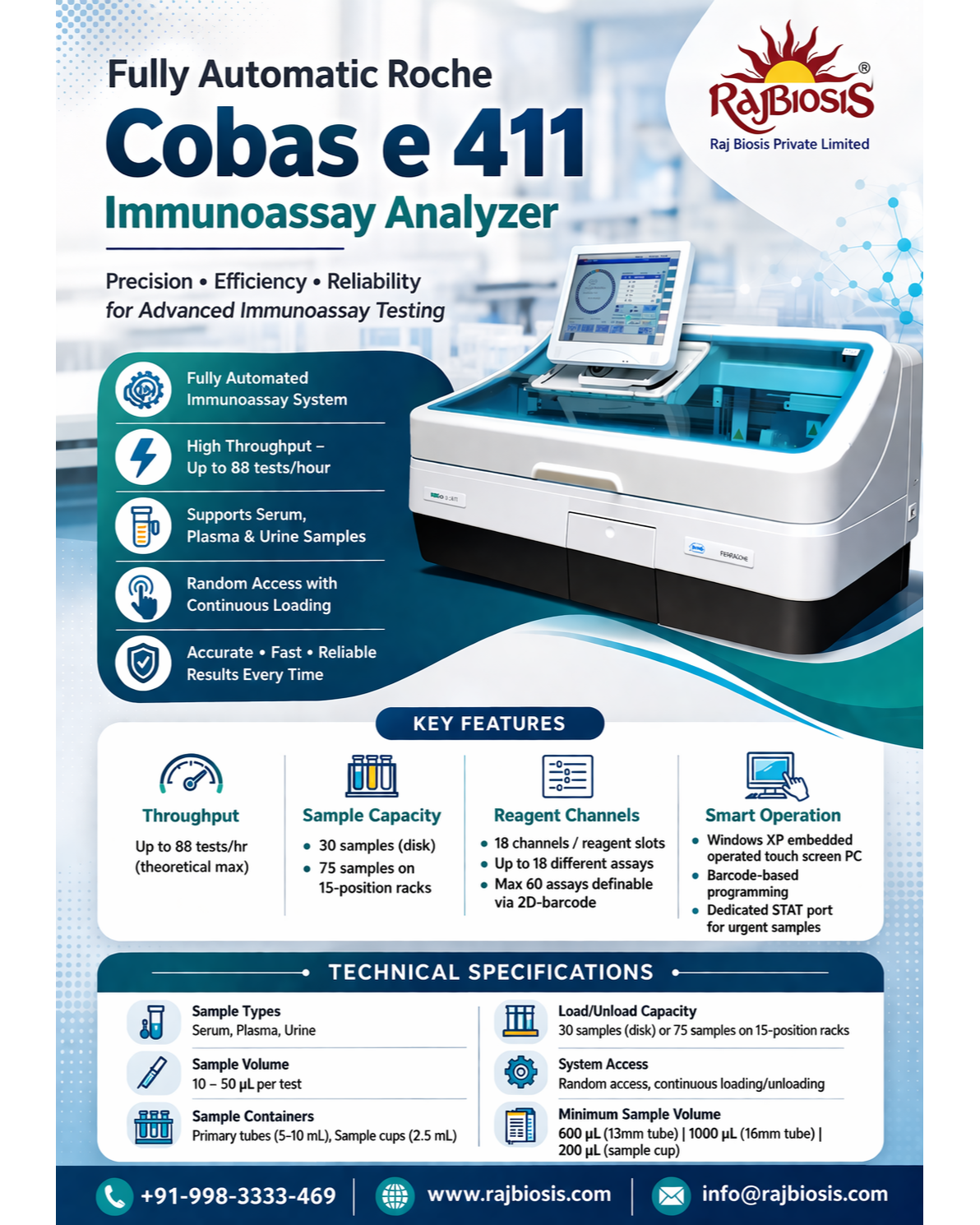The Cobas e 411 is a fully automated, high-performance immunoassay analyzer designed to deliver accurate, reliable, and fast diagnostic results for modern laboratories. Built with advanced electrochemiluminescence (ECL) technology, it ensures high sensitivity and precision across a wide range of assays. The system features random access functionality, allowing continuous loading and efficient workflow management without interruptions. With its user-friendly touchscreen interface and robust software, the Cobas e 411 enhances laboratory productivity while minimizing manual intervention. It is ideal for medium-sized laboratories seeking consistent performance, flexibility, and high-quality results in routine and specialized testing.offering a throughput of up to 88 tests per hour (theoretical maximum). It features 18 reagent channels, enabling up to 18 different assays to be performed simultaneously. The analyzer supports multiple sample types including serum, plasma, and urine, and provides flexible sample handling with a load/unload capacity of 30 samples on a disk or up to 75 samples using 15-position racks. It operates on a random access system with continuous loading capability and includes a dedicated STAT port for urgent samples. The required sample volume ranges from 10 to 50 µL per test, with minimum sample volume requirements of approximately 600 µL for 13 mm tubes, 1000 µL for 16 mm tubes, and around 200 µL for sample cups. It accommodates primary tubes (5–10 ml) as well as 2.5 ml sample cups. The system is equipped with a Windows-based touchscreen interface for easy operation, along with barcode-based programming for efficient workflow and assay management, making it suitable for medium to high workload laboratories.#FullyAutomated #ImmunoassayAnalyzer #CobasE411 #DiagnosticSolutions #LabAutomation #ClinicalDiagnostics #HighThroughput #AccurateResults #LaboratoryEquipment #MedicalDevices #PathologyLab #HealthcareInnovation #AdvancedDiagnostics #ReliablePerformance #PrecisionTesting #LabTechnology #ModernLaboratory #EfficientWorkflow #InVitroDiagnostics