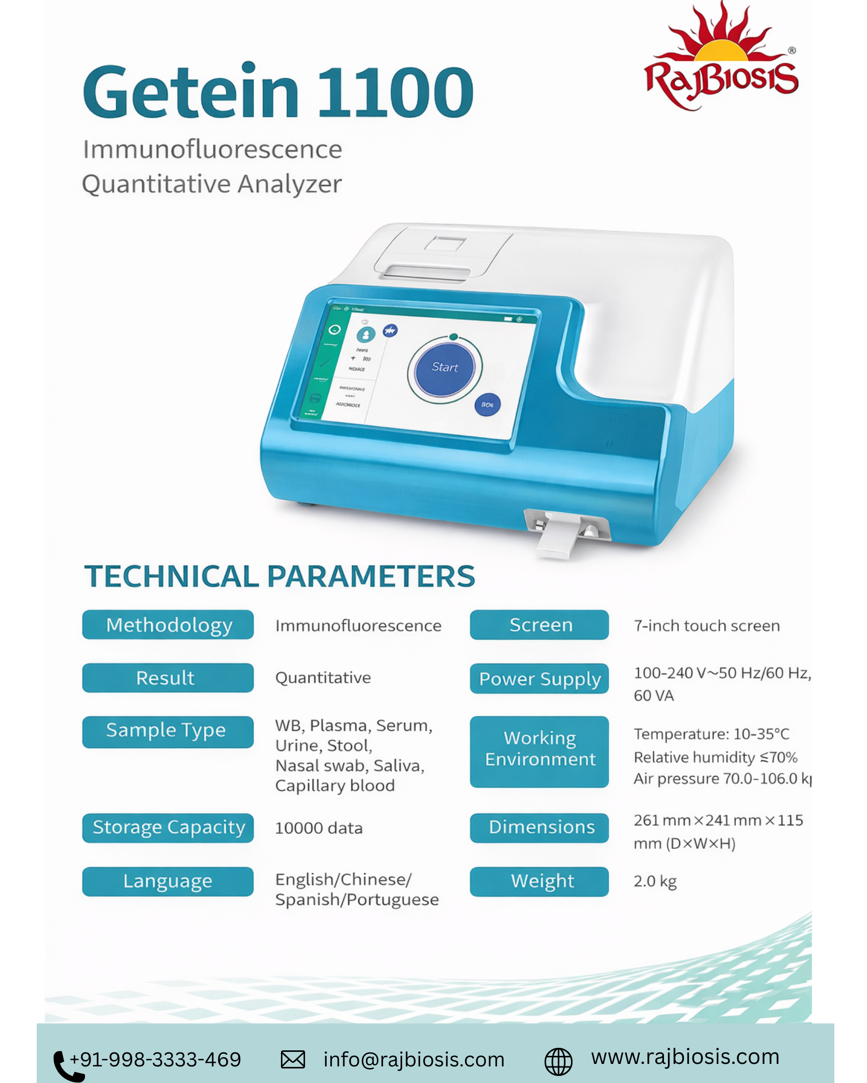 Getein 1100 Immunofluorescence Quantitative Analyzer is an advanced and compact point-of-care diagnostic instrument designed to deliver fast, accurate, and reliable quantitative results for a wide range of clinical tests. Developed by Getein Biotech, the analyzer uses Lateral Flow Chromatography combined with Immunofluorescence technology, enabling high-precision detection and measurement of biomarkers from small sample volumes. The device is designed with a portable and user-friendly structure, making it suitable for use in hospitals, diagnostic laboratories, emergency departments, intensive care units, clinics, and research facilities where rapid testing is required. The Getein 1100 analyzer features a 7-inch touch screen display, allowing easy navigation and efficient operation for laboratory professionals. It provides quantitative test results within minutes, helping healthcare providers make quick and accurate clinical decisions. The instrument supports multiple sample types including whole blood, plasma, serum, urine, and other clinical specimens, making it versatile for different diagnostic applications. Its compact design measures 261 mm × 241 mm × 115 mm (DxWxH) and weighs approximately 1.9 kg, ensuring easy placement and portability within laboratory environments. The analyzer is equipped with data storage capacity of up to 10, 000 test results, enabling efficient record management and traceability of diagnostic data. It supports multiple languages including English and Chinese, making it convenient for global use. The device also features multiplex testing capability, allowing multiple parameters to be tested efficiently. Its LIS and HIS connectivity ensures seamless integration with laboratory information systems and hospital information systems for better workflow management and digital reporting. #Getein1100 #GeteinAnalyzer #ImmunofluorescenceAnalyzer #QuantitativeAnalyzer #POCTAnalyzer #PointOfCareTesting #FluorescenceImmunoassay #DiagnosticAnalyzer #MedicalDiagnostics #LaboratoryEquipment #MedicalLabEquipment #DiagnosticMachine #ClinicalDiagnostics #HospitalEquipment #RapidTestAnalyzer #LabAnalyzer #MedicalDevices #DiagnosticEquipment #GeteinBiotech