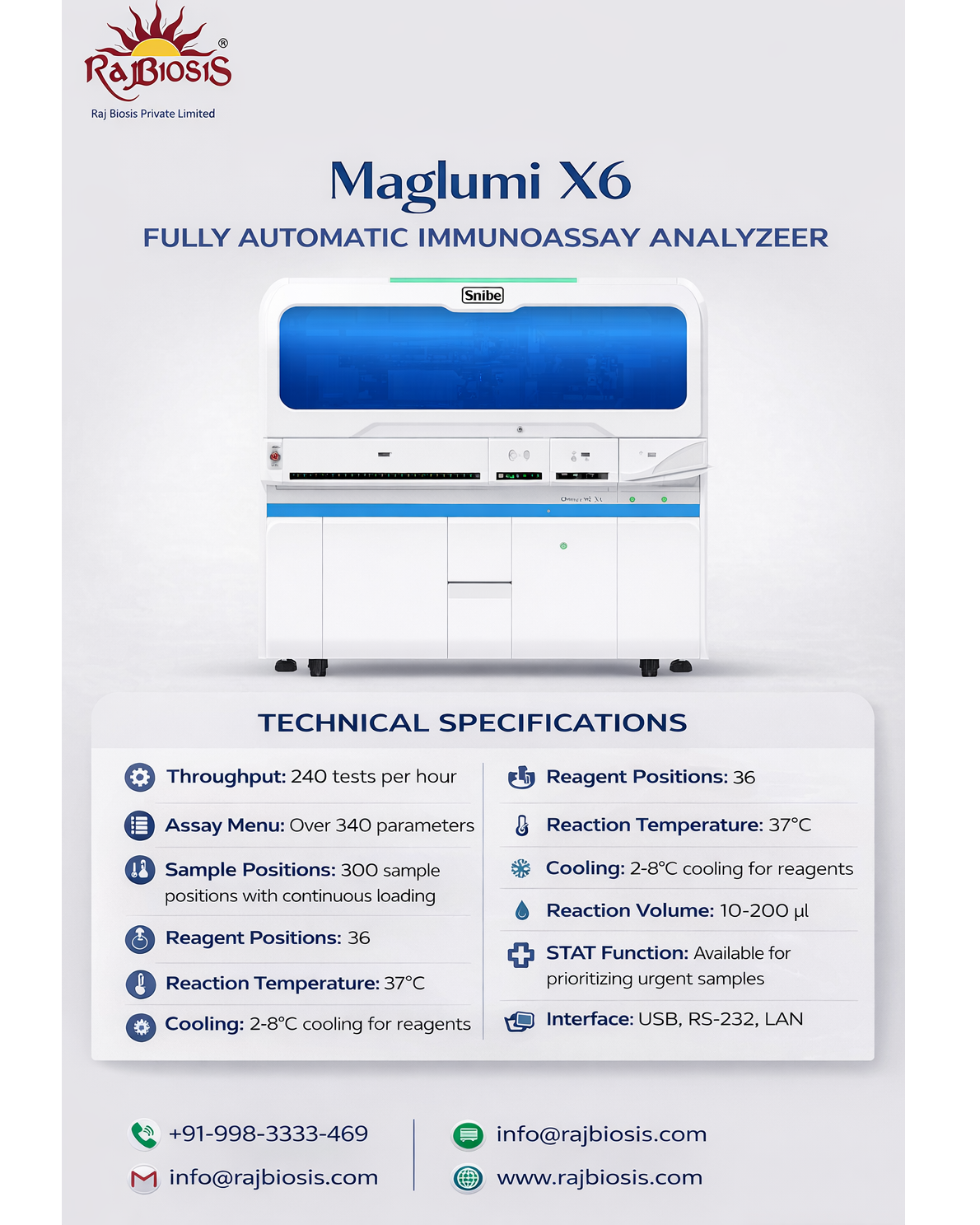 The Maglumi X6 Fully Automatic Immunoassay Analyzer is an advanced chemiluminescence immunoassay system designed to provide accurate, reliable, and high-throughput testing for clinical laboratories. Developed to meet the demands of modern diagnostic laboratories, the Maglumi X6 delivers rapid and precise immunoassay testing with fully automated operation, reducing manual intervention and improving laboratory efficiency. The system supports a wide range of clinical tests including hormone analysis, tumor markers, cardiac markers, infectious disease testing, and other specialized immunoassays. With its intelligent workflow, continuous sample loading capability, and user-friendly interface, the analyzer ensures smooth laboratory operations and consistent diagnostic results.Maglumi X6 Immunoassay Analyzer offers a high throughput of up to 240 tests per hour, enabling laboratories to handle large sample volumes efficiently. It features approximately 300 sample positions with continuous loading, allowing uninterrupted processing of samples. The system includes 36 reagent positions with refrigerated storage maintained at 2–8°C to preserve reagent stability. The analyzer operates with a reaction temperature of 37°C to ensure optimal assay performance and supports a reaction volume ranging from 10–200 µL. The instrument provides access to an extensive assay menu of more than 340 parameters, covering a wide range of clinical diagnostics. It also includes a STAT function for prioritizing urgent samples, ensuring faster turnaround for critical tests. For connectivity and data management, the analyzer supports USB, RS-232, and LAN interfaces, allowing seamless integration with laboratory information systems and external devices. #MaglumiX6 #ImmunoassayAnalyzer #FullyAutomaticAnalyzer #CLIAAnalyzer #Chemiluminescence #LaboratoryAutomation #ClinicalDiagnostics #MedicalDiagnostics #DiagnosticEquipment #LabTechnology #ClinicalLaboratory #MedicalLaboratory #HealthcareTechnology #DiagnosticLab #LaboratoryEquipment #InVitroDiagnostics #HospitalLaboratory #LabInnovation #DiagnosticSolutions