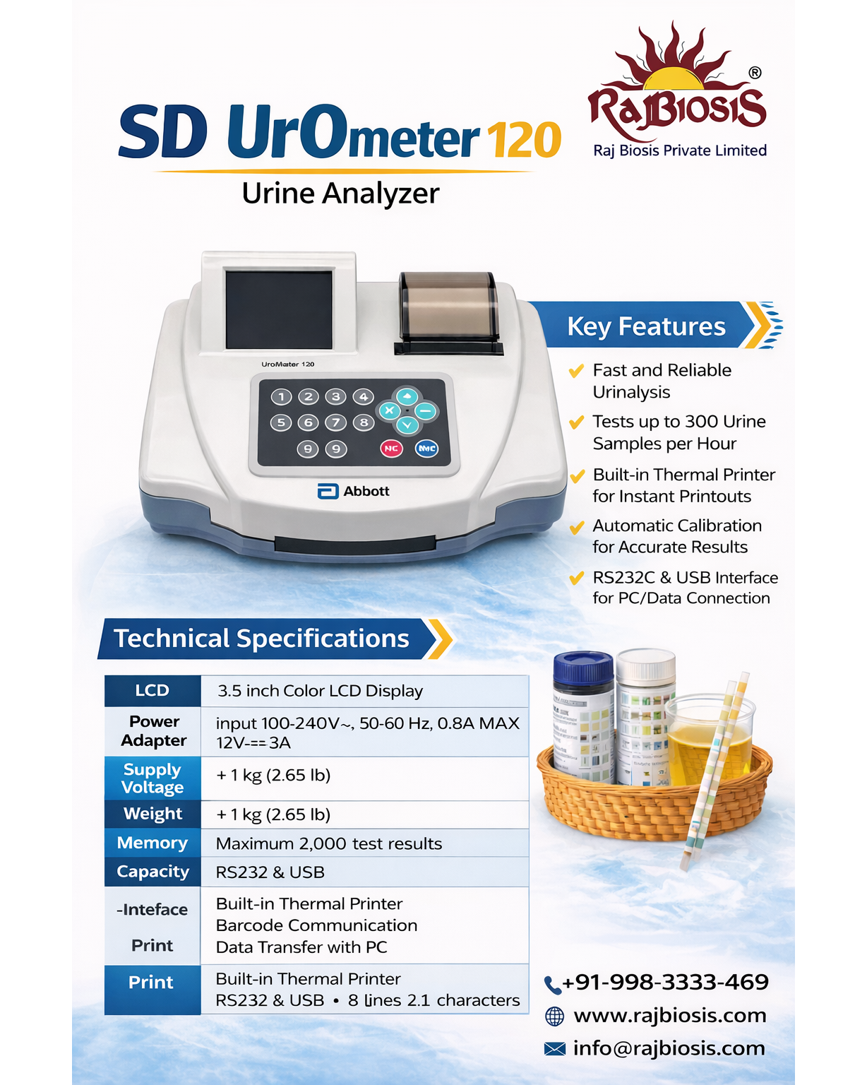 The SD UrOmeter 120 Urine Analyzer is a fast, reliable, and efficient diagnostic device designed for high-throughput urinalysis in clinical and laboratory environments. It is capable of processing up to 300 urine samples per hour, making it ideal for busy healthcare settings. The analyzer features a built-in thermal printer for instant result printouts and supports automatic calibration to ensure accurate and consistent results. It also offers flexible ID input options via keyboard, PC, or barcode reader, along with software update capability through internet access. Additionally, the device supports RS232 and USB interfaces, enabling smooth communication with computers and barcode systems for efficient data management. From a technical perspective, the analyzer operates on a power adapter input of 100–240V AC, 50–60 Hz with a maximum current of 0.8A, and provides an output of +12V DC at 3A. It is compact in size with dimensions of 200 mm (depth), 252 mm (width), and 114 mm (height), and weighs approximately 1.2 kg, making it easy to handle and install. The system has a memory capacity of up to 2, 000 test results, ensuring efficient data storage. It includes an internal thermal printer and an LCD display capable of showing 8 lines with 21 characters each for clear and organized result viewing. The interface options include RS232 ports (COM1 for PC communication and COM2 for barcode system connection) as well as USB connectivity, making it a comprehensive and user-friendly solution for modern urinalysis requirements. #SDUrOmeter120 #UrineAnalyzer #Urinalysis #MedicalEquipment #DiagnosticDevice #LaboratoryEquipment #HealthcareTechnology #PointOfCare #ClinicalDiagnostics #AutoCalibration #ThermalPrinter #MedicalDevices #LabInstruments #HealthcareSolutions #UrineTesting #DiagnosticTools #MedicalInnovation #HospitalEquipment #PathologyLab