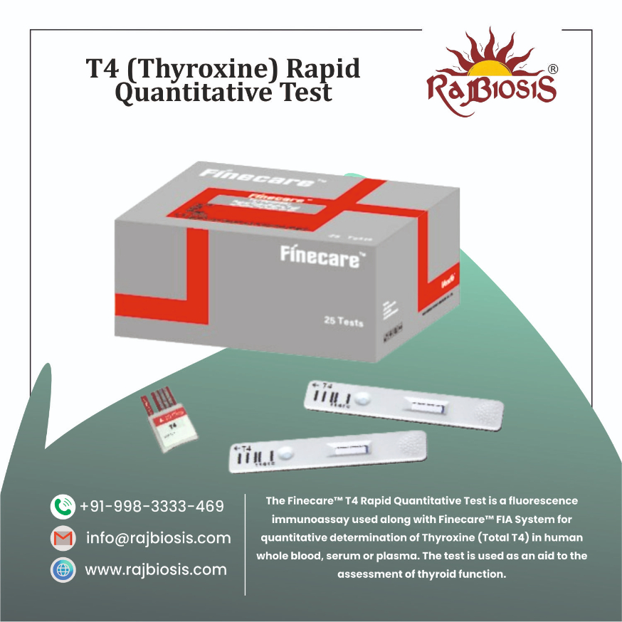 T4 (Thyroxine) Rapid Quantitative Test :- The Finecare T4 Rapid Quantitative Test is a fluorescence immunoassay used along with the Finecare FIA System for quantitative determination of thyroxine (Total T4) in human whole blood, serum, or plasma. The test is used as an aid to the assessment of thyroid function. T4 (Thyroxine) Rapid Quantitative Test In Jaipur #T4RapidTest #ThyroxineTestKit #T4QuantitativeTest #ThyroidTestingSimplified #QuickT4Results #T4Diagnostics #ThyroidHealthMadeEasy #RapidThyroidCheck #AccurateT4Testing #ThyroidScreeningSolutions #ReliableT4Test #T4HealthMonitor #AdvancedThyroidTesting #SmartThyroxineTest #ThyroidCareFastAndAccurate